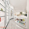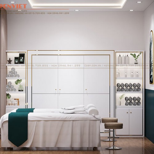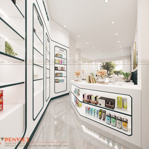 Do diện tích nhỏ, bởi vậy, phương án thiết kế spa tối ưu được chúng tôi lựa chọn là dùng các tủ trưng bày âm tường với các đợt tủ bằng gỗ MDF chống ẩm phủ Melamine kết hợp phun sơn trang trí để bày bán được nhiều sản phẩm.