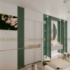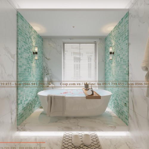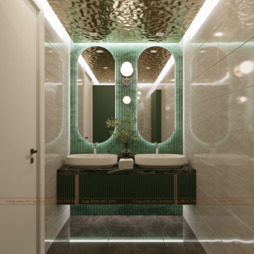 Căn cứ vào đặc điểm mặt bằng cũng như mang đến sự mới lạ cho từng phòng chức năng, các kiến trúc sư của chúng tôi đã sáng tạo thiết kế vách treo tủ Lavabo bằng gỗ MDF chống ẩm sơn bệt màu xanh, đèn Led hắt sáng, mặt đá nhân tạo màu trắng.