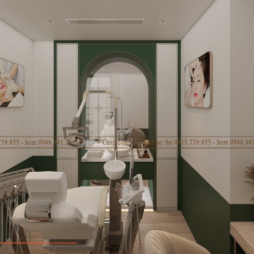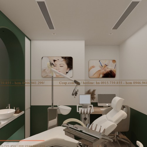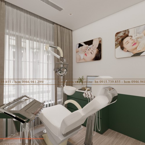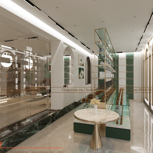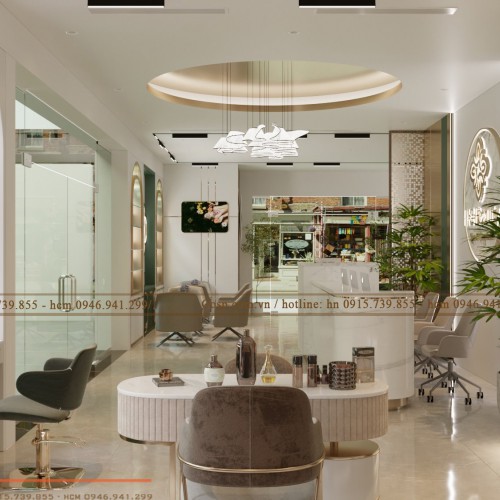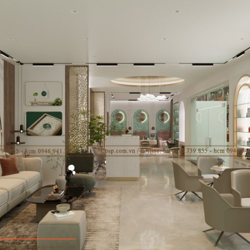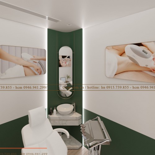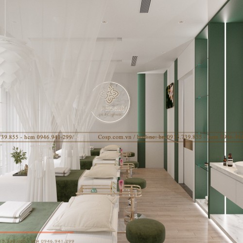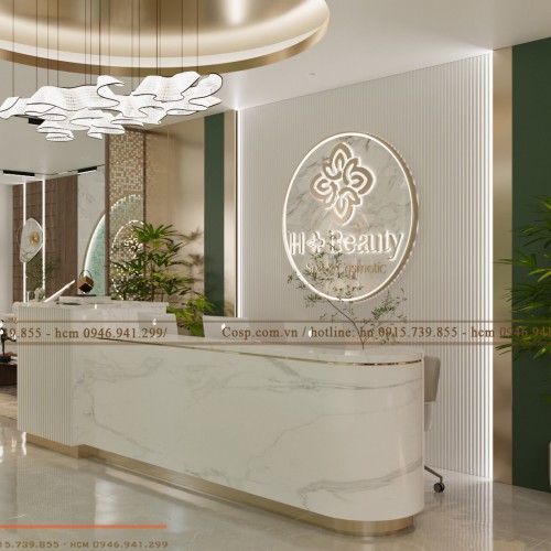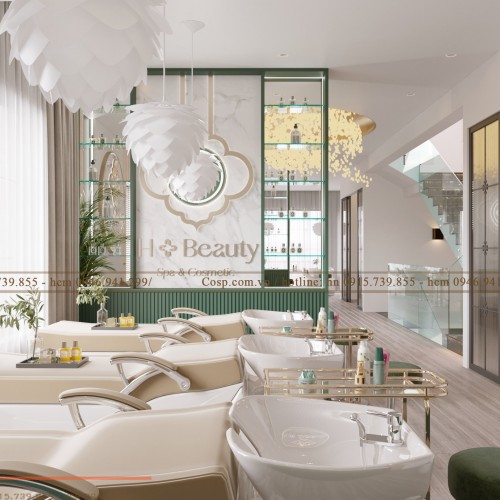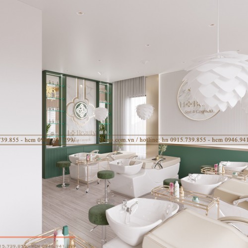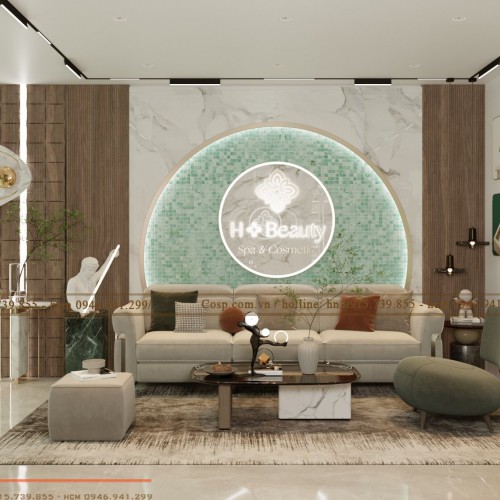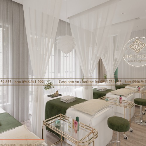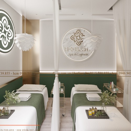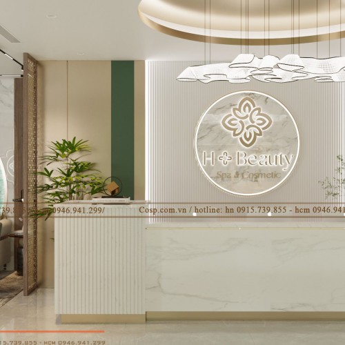 Sau khi lắng nghe nhu cầu của khách hàng và khảo sát hiện trạng mặt bằng, chúng tôi tư vấn cho chủ đầu tư setup spa theo phong cách hiện đại, hướng đến sự sang trọng, sử dụng màu trắng để làm nổi bật tính chuyên nghiệp cũng như giúp tôn lên những chi tiết trang trí màu xanh, nhũ vàng, tạo được sức hút cho H+ Beauty.