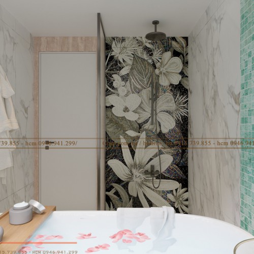Vách gỗ MDF chống ẩm bẹt màu trắng nẹp Inox vàng gương kết hợp với gạch Mosaic màu xanh tại đây tạo nên điểm nhấn thú vị cho thiết kế nội thất spa.