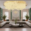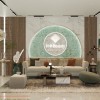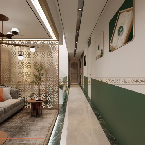 Vẫn hướng đến sự sang trọng, hiện đại, khu vực sảnh chờ tầng 2 được Penviet setup ấn tượng sử dụng vách ngăn khung gỗ MDF chống ẩm phủ Melamine, CNC MDF chống ẩm sơn nhũ vàng họa tiết độc đáo tạo nét mới lạ cho không gian.