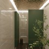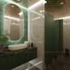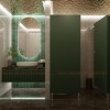 Tại đây, chúng tôi sử dụng vách compact HPL sơn bệt màu xanh, phụ kiện Inox cao cấp, tủ Lavabo gỗ MDF chống ẩm sơn bệt, mặt đá nhân tạo và gương Bỉ, cho thấy sự đầu tư chỉn chu cho không gian.