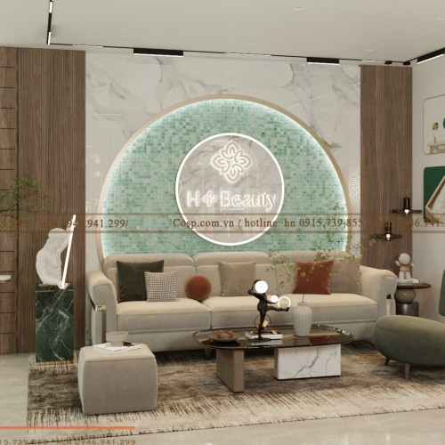 Vách trang trí phía sau sofa được tạo nên từ hệ vách nan gỗ MDF chống ẩm phủ Melamine sát tường, hậu vách MDF chống ẩm và hộp Mica Đài Loan cao cấp phát sáng bề mặt, chân Inox gương vàng gấp mặt, nền PVC vân đá sáng màu, mặt Logo Inox gương, chân chữ Mica trắng sữa hắt sáng chân cùng bộ chữ tên cửa tiệm mặt chữ Inox gương vàng, chân chữ Mica trắng sứ hắt sáng giúp tăng cường nhận diện thương hiệu cho H+ Beauty.