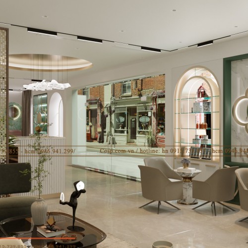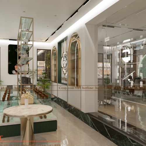 Quầy lễ tân được chúng tôi bố trí ở vị trí phù hợp giúp nhân viên dễ dàng bao quát cửa tiệm và hỗ trợ khách hàng một cách nhanh chóng.