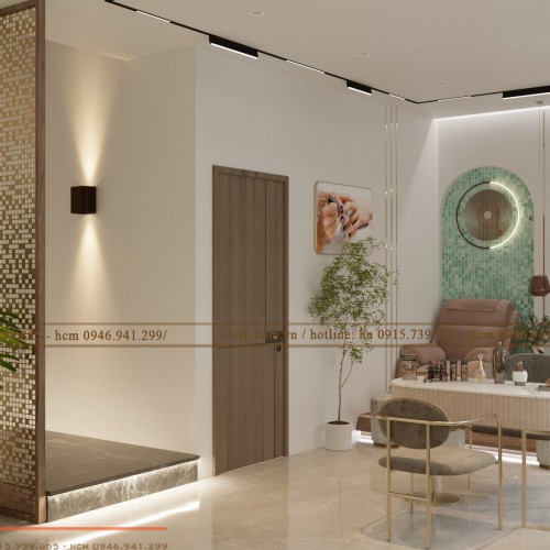 Việc bố trí các ghế nail khung gỗ tự nhiên, nệm bọc nỉ cao cấp sát tường, bên trên bục nâng sàn khung thép hộp mạ kẽm, nền gỗ MDF chống ẩm phủ Melamine, viền dán V Inox vàng gương kết hợp với đèn Led chẳng những giúp tối ưu diện tích sử dụng của mặt bằng mà còn tạo sự thu hút cho thiết kế spa. Việc lựa chọn và kết hợp vật liệu tinh tế hướng tới việc mang đến cho khách hàng những trải nghiệm tuyệt vời tại cửa tiệm.