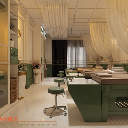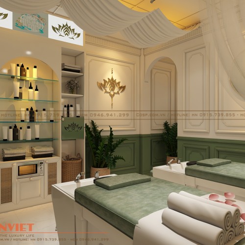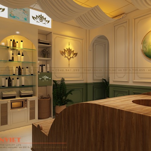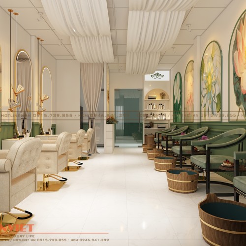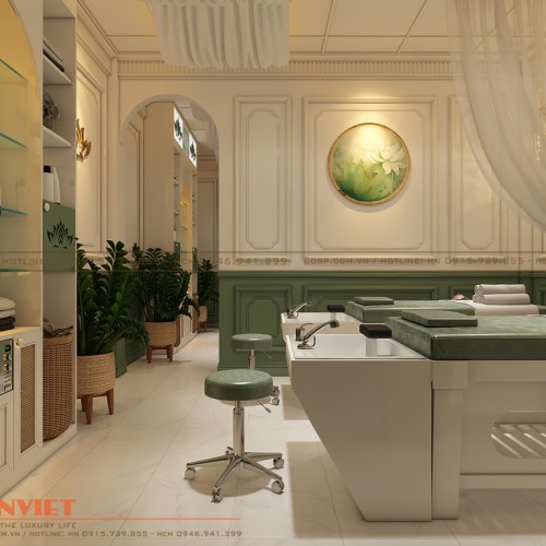 Bước chân vào spa, khách hàng sẽ cảm nhận được không gian nhẹ nhàng và đầy sang trọng trong từng chi tiết màu sắc, ánh sáng hay cách bố trí đồ nội thất. Với gam màu be và xanh chủ đạo mang lại vẻ đẹp hiện đại và đầy sức sống cho spa.