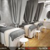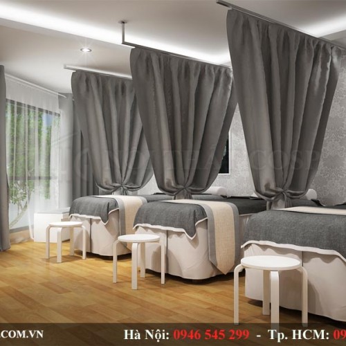 Chắc chắn không ai có thể nghỉ ngơi, thư giãn trong một không gian thiếu đi sự riêng tư cần thiết. Hiểu được điều đó, mỗi chiếc giường spa đều được chúng tôi ngăn cách bởi chiếc rèm màu ghi xám, giúp tạo được không gian riêng tư đồng thời mang đến sự sang trọng và cao cấp cho thiết kế spa chị Phượng.