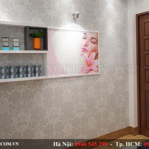 Đồng thời không gian bức tường không hề bị nhàm chán mà trở nên linh động hơn khá nhiều với những bức tranh backlist. Những bức tranh backlist treo tường làm điểm nhấn khá ấn tượng, mang đến sự trẻ trung và tươi mới cho không gian, góp phần tạo nên một thiết kế spa đẹp.