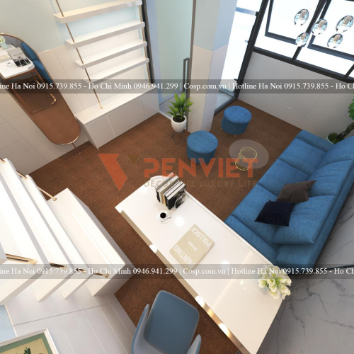 Bàn làm việc cũng thế, nó được làm từ gỗ MDF cao cấp nên rất chắc chắn. Bàn có nẹp viền inox tạo nên điểm nhấn nội thất. Trong khi đó, bộ sofa nỉ màu xanh dương cũng nổi bật không kém. Nhìn từ trên chúng ta có thể chú ý tời ngay bộ sofa phải không.