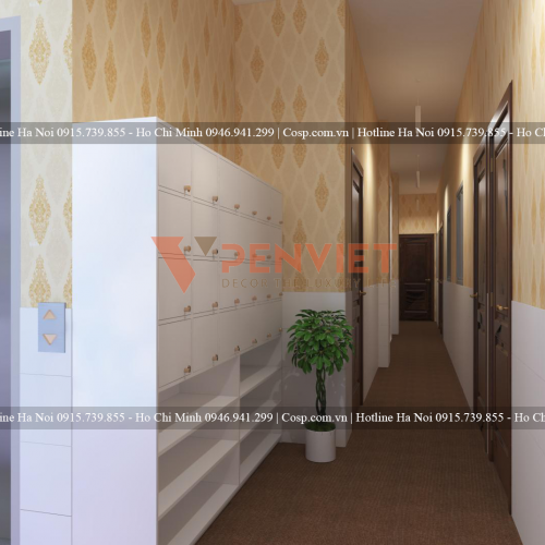 Tại phần không gian này, chúng tôi tận dụng khoảng trống này để kê vào đó 1 chiếc tủ sát tường màu trắng xinh xắn. Tủ này là nơi chứa đồ cá nhân của khách nên có thiết kế nhiều ngăn nhỏ. Phần nửa dưới là giá để giầy dép cho khách trước khi bước vào phòng sử dụng dịch vụ spa.