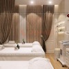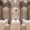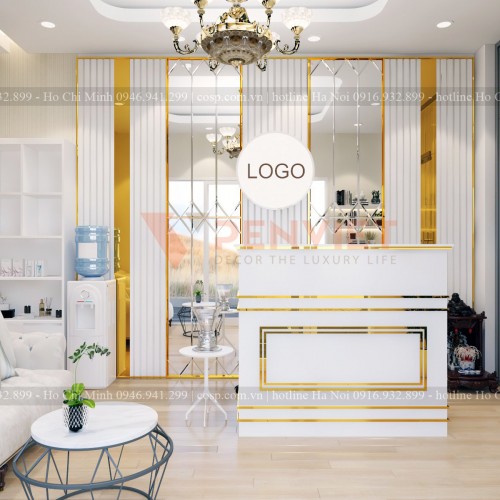 Mang tone màu chủ đạo là hai màu trắng và vàng, kết hợp với nhau với những đường nét tinh tế tạo không gian spa sang trọng và lộng lẫy. Cùng với đó là những đường viền bằng inox mạ vàng sáng bóng khiến không gian càng trở nên ấn tượng và đẳng cấp.