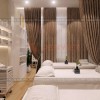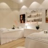 Phòng khách spa cũng được thiết kế sang trọng với tone màu trắng làm chủ đạo với điểm nhấn là những nẹp viền inox vàng gương nổi bật.
