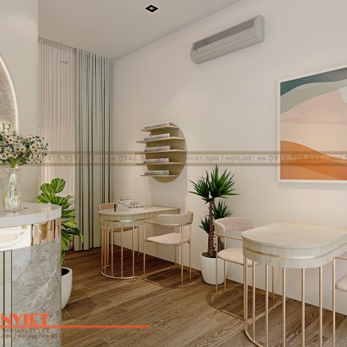 Tận dụng tối đa không gian ở khu vực này chúng tôi cũng setup thêm bàn soi da bằng gỗ MDF. Và bàn nail với thiết kế đơn giản, nhỏ gọn tiết kiệm diện tích mà vẫn đảm bảo công năng sử dụng và tính thẩm mỹ cho không gian.
