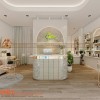 Quầy thu ngân được thiết kế với chất liệu gỗ MDF chống ẩm sơn 2k được đẩy về cuối phòng giúp cho nhân viên dễ dàng bao quát toàn bộ không gian để hỗ trợ khách hàng một cách nhanh chóng, kịp thời. Họa tiết vân đá cùng việc trang trí viền Inox mạ xi vàng gold tạo được sự sang trọng, đẳng cấp cho mẫu thiết kế spa.