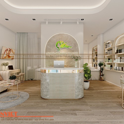 Được thiết kế trở thành nơi tiếp đón cũng như setup thêm một số khu vực như soi da, làm nail thì kiến trúc sư đã rất đầu tư trong việc lựa chọn sản phẩm nội thất đến cách trang trí, decor thương hiệu.
