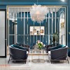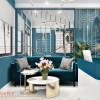 Bộ sofa màu xanh ấn tượng, đậm chất Tân Cổ Điển được bọc nệm cùng với bàn trà được thiết kế bắt mắt tạo nên không gian vô cùng sang trọng.