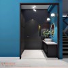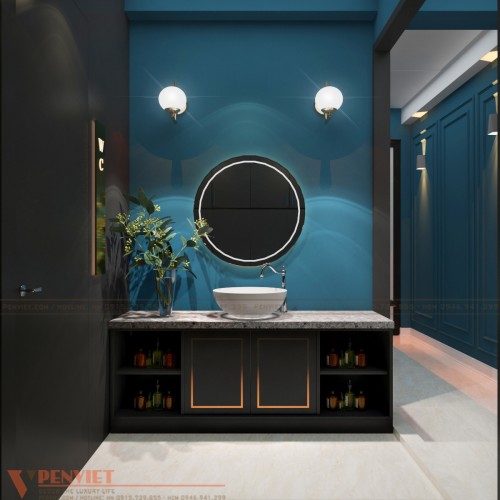 Tiếp đến là khu vực nhà vệ sinh, PenViet lựa chọn tone màu xanh để tạo sự đồng điệu cho toàn bộ cửa tiệm. Đặc biệt, kiến trúc sư rất tinh tế trong việc decor gương, labo ở trước cửa WC để phục vụ nhu cầu của khách hàng.
