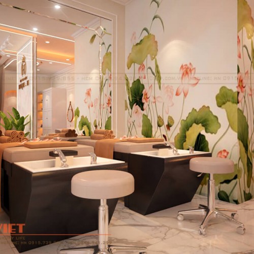 Không gian gội đầu được trang trí với tranh in UV với hình ảnh đầm sen, khơi gợi không khí thư giãn, thoải mái, dễ chịu cho khách hàng đang sử dụng dịch vụ. Các kiến trúc sư của chúng tôi đã tư vấn giúp chủ tiệm thiết kế 2 giường gội đầu với chất liệu và tông màu đồng bộ, tạo nét hài hòa, sang trọng và tinh tế. Đặc biệt phần cuối giường gội được trang trí gương mài vát dày 5 ly chắc chắn tạo một không gian có chiều sâu, thoáng đãng và giúp khách hàng có thể soi ngắm lại vẻ đẹp của mình.