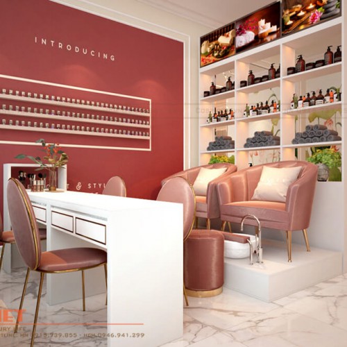 Bàn làm nail tay được làm từ gỗ MDF chống ẩm được thiết kế với hình dáng nhỏ gọn kết hợp với ghế ngồi bọc da màu hồng đỗ, chân mạ inox vàng vô cùng bắt mắt. Việc lựa chọn cường độ màu sắc cho bất kỳ chi tiết nào cũng đều được các kiến trúc sư vô cùng chú trọng, bởi dù là những chi tiết nhỏ cũng có thể ảnh hưởng đến toàn bộ không gian.