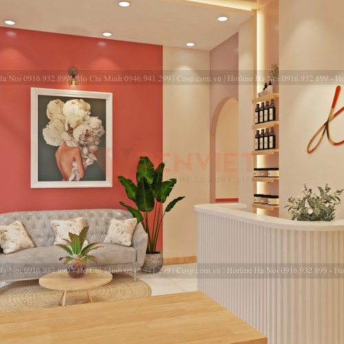 Hiện nay, thiết kế spa với những gam màu trang nhã, trong trẻo phong cách Hàn Quốc là xu hướng được nhiều chủ đầu tư yêu thích và lựa chọn. Nó có thể phù hợp với mọi không gian và diện tích bởi lối thiết kế đơn giản, không cầu kỳ. Khu vực sảnh tiếp đón của Thiên Kim spa được thiết kế nhẹ nhàng với gam màu kem và đỏ hồng.