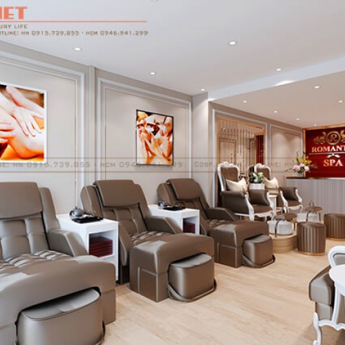 Ngoài việc bố trí các ghế massage cao cấp, Penviet còn sử dụng các tab nhỏ bằng gỗ MDF chống ẩm phủ Melamine trong thiết kế nội thất spa Romantic để mang đến sự tiện dụng cho khách hàng.
