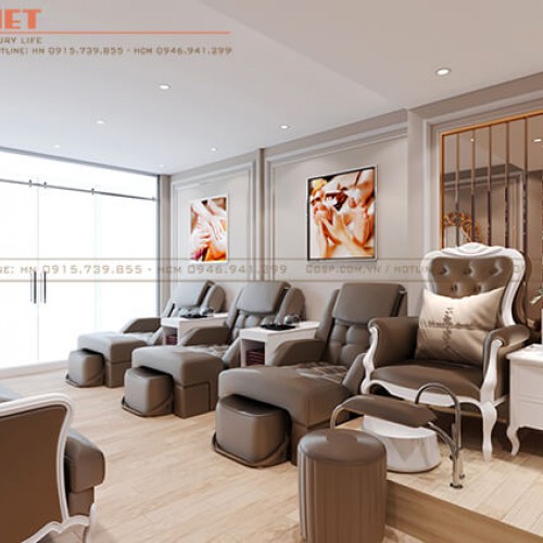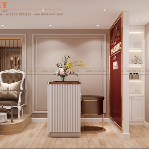 Hướng đến việc tạo dựng hình ảnh một cơ sở làm đẹp sang trọng, đẳng cấp, chúng tôi đã tư vấn cho chủ đầu tư setup cửa tiệm theo phong cách Tân Cổ Điển. Những gam màu, chi tiết trang trí được xem là đặc trưng của lối thiết kế này cũng được kết hợp một cách linh hoạt, không chỉ mang đến tính thẩm mỹ mà còn gây được ấn tượng với khách hàng. Việc sử dụng vật liệu nội thất cao cấp cũng là một cách thức được Penviet sử dụng để làm toát lên tinh thần của mẫu thiết kế spa này.