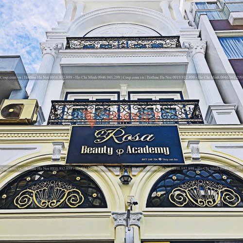 Quầy lễ tân bằng gỗ MDF phun sơn 2K màu được gắn thêm alu vàng gương ở các viền cạnh giúp chiếc quầy lễ tân trông rất hiện đại và cao cấp. Tấm vách kính logo bên cạnh được thiết kế bằng khung sắt CNC sơn màu. Tấm kính màu trà cường lực 8li được gắn cùng bộ chữ “THUY VAN BUI”, “ROSA”, “ACADEMY” bằng alu màu vàng 24K có kích thước 1350x10x650.