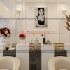 Tại khu vực tiếp đón khách thì không thể thiếu các bộ ghế chờ đúng không nào. Chúng tôi sử dụng loại ghế với chân inox xi vàng, nệm vải bố màu trắng để tạo tính đồng nhất trong thiết kế spa. Giữa mỗi ghế chờ được đặt một chiếc bàn chân inox xi vàng với mặt đá nhân tạo làm nơi mời trà đón khách.