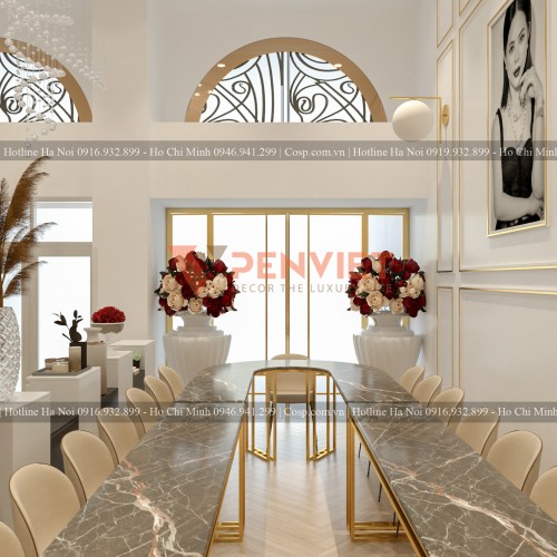 Khu vực đạo tạo thì được kê hai dãy bàn với hai loại khác nhau là bàn dài và bàn chữ U đặt sát nhau để tạo sự liền mạch trong không gian học tập. Hai loại bàn học này đều được thiết kế với chân inox 25x25 mạ xi màu vàng gold cùng mặt đá Marble.