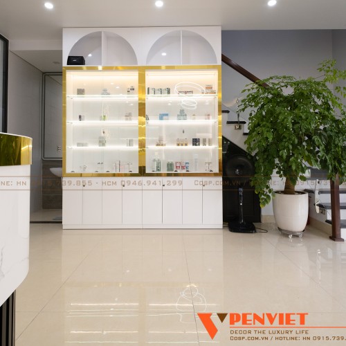 Khu vực sảnh trong mẫu thiết kế spa Rusy được chúng tôi tư vấn tận dụng để bố trí hệ tủ trưng bày bằng gỗ MDF chống ẩm kết hợp cánh phủ acrylic, mặt cánh kính và các tủ gỗ MDF lõi xanh chống ẩm Thái Lan sơn 2k màu trắng, đợt gỗ, cánh kính nhằm giới thiệu tới khách hàng những sản phẩm làm đẹp tại đây.