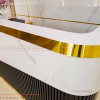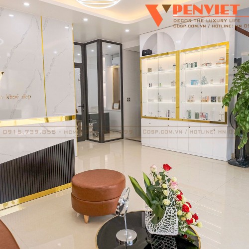 Để tạo sự đồng điệu, nhất quán cho thiết kế spa, PenViet tư vấn ốp vách tường sau quầy lễ tân bằng tấm PVC vân mây, dán chỉ T inox vàng, giúp tôn lên bộ nhận diện thương hiệu mặt inox vàng gương chân mica phát sáng chân cùng slogan bằng inox vàng gương. Ý tưởng này được chủ đầu tư tán đồng và ủng hộ.