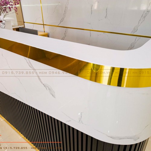 Quầy lễ tân làm từ gỗ MDF lõi xanh chống ẩm Thái Lan phun sơn 2k màu trắng, mặt ngoài ốp tấm PVC vân mây kết hợp soi gỗ sơn 2k màu xám có khe led phát sáng, khung chân và trán quầy ốp Alu vàng gương.