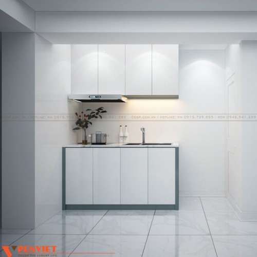 Khu bếp được thiết kế hiện đại, lắp đặt tủ bếp dưới bằng gỗ nhựa, mặt đá Marble vân trắng có khoét lỗ lắp Lavabo. Điều này cho thấy kinh nghiệm cũng như kiến thức chuyên môn của các kiến trúc sư Penviet khi lựa chọn vật liệu phù hợp với yêu cầu sử dụng nhằm đảm bảo độ bền, tính thẩm mỹ của sản phẩm.