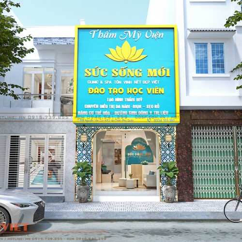 Mặt tiền spa thu hút người nhìn với tấm biển bảng kích thước lớn với sự kết hợp các gam màu xanh, trắng vàng. Bên cạnh đó, PenViet sử dụng phương án ốp mặt tiền khung Alu vàng gold cùng đèn LED chiếu sáng. Cách bố trí này này hiệu ứng nổi bật, thu hút khách hàng quan tâm và ghé đến spa.