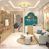 Ngoài ra, đối diện tầm nhìn của bạn là quầy lễ tân và hệ vách logo thương hiệu nổi bật phía sau. Sự kết hợp các gam màu xanh, trắng, vàng rất hài hòa, tạo nên tổng thể ấn tượng mà không rối mắt.