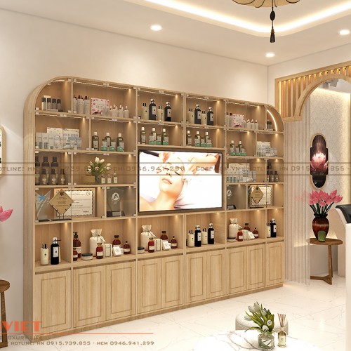 Đối diện vách trang trí là hệ thống tủ gỗ trưng bày sản phẩm đặt sát tường để tăng diện tích không gian. Tủ thiết kế bo tròn góc trên đỉnh tạo cảm giác mềm mại, mộc mạc, gần gũi. Chính giữa kệ tủ là nơi đặt chiếc màn hình để khách hàng có thêm những thông tin làm đẹp hữu ích.