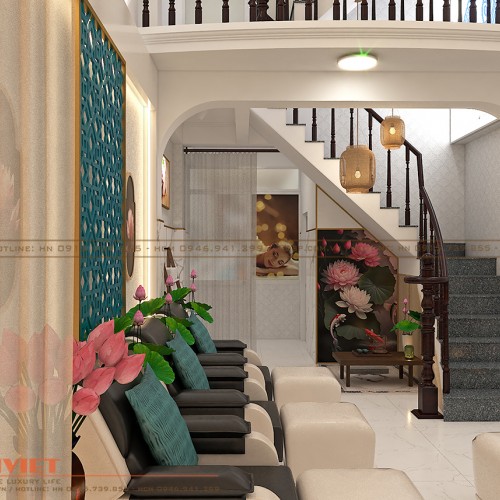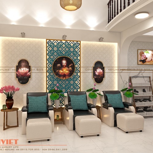 Tổng thể khu vực phòng chăm sóc sắc đẹp lấy hình tượng hoa sen trang trí, mang đến sự thanh tịnh và an yên trong tâm hồn khách hàng khi sử dụng dịch vụ.