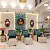 Sự kết hợp của hệ thống đèn chiếu sáng cùng các vách decor bằng khung gỗ sơn nhũ vàng tạo cảm giác thân thiện, ấm cúng và gần gũi cho spa.