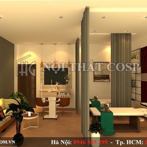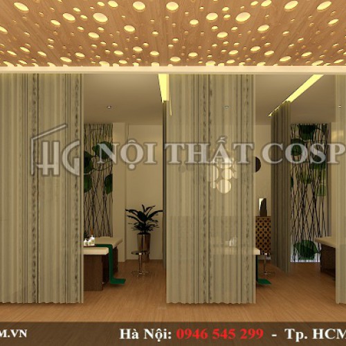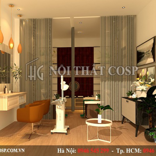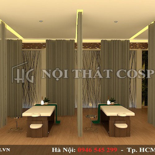 Cũng như nhiều thiết kế spa khác, ngoài mang lại vẻ đẹp thẩm mỹ thì spa cần đáp ứng được yếu tố công năng sử dụng, sao cho mang tới sự thuận tiện nhất cho người sử dụng. Phòng spa 02 là nơi thực hiện các dịch vụ chăm sóc da body chuyên sâu, chúng tôi cũng bố trí rèm ngăn cách giữa các giường để đảm bảo sự riêng tư và thoải mái cho khách hàng