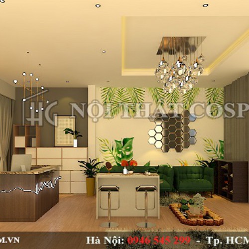 Thiết kế spa của anh Long đã chiếm trọn lòng tin của khách hàng với những thiết kế độc đáo từ nội thất cao cấp. Ngoài ra, những KTS của Penviet đã đưa rất nhiều yếu tố thiên nhiên vào trong không gian phòng khách spa như: tấm thảm cỏ, tường được dán bởi hình cỏ cây hoa lá tươi mát, chậu hoa xanh tươi được bố trí trên các bàn và trên bàn lễ tân. Sự kết hợp hài hòa của thiên nhiên cùng với nội thất màu xanh lá đã giúp khách hàng có được tâm lý thoải mái, gần gũi hơn.