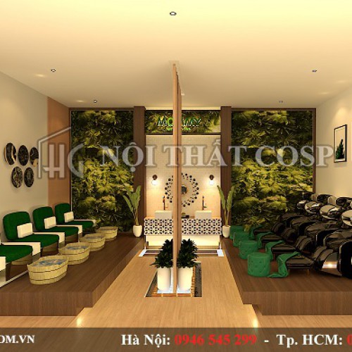 Hai bên tường được trang trí bởi những bức tranh thiên nhiên rất đẹp, phần tường còn lại được dán một bức tranh thiên nhiên gần gũi. Tại đây, khách hàng vừa được thư giãn trên các ghế ngồi massage cao cấp vừa như được lạc vào trong một khu rừng tươi mát của thế giới bên ngoài.