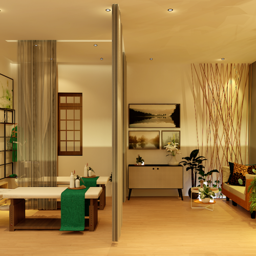 Không để mất đi yếu tố thiên nhiên xuyên suốt mẫu thiết kế, chúng tôi trang trí tường bằng tranh hình là cây vô cùng bắt mắt. Ở khu vực phòng trị liệu khác, chúng tôi sử dụng tấm rèm bằng lụa màu vàng nhạt trải dài từ trần nhà xuống sàn để phân chia khu vực ngâm chân và khu vực ghế ngồi massage.