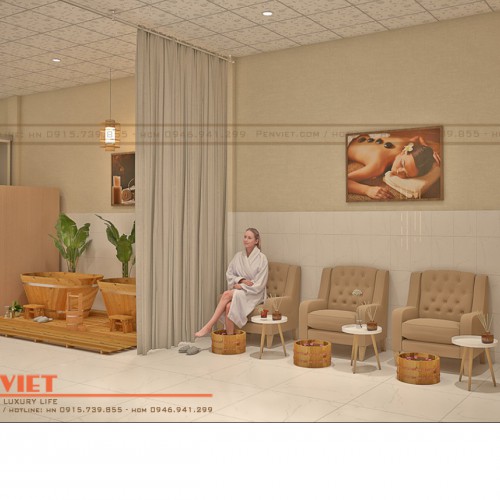 Tại khu vực này, Penviet sử dụng ghế sofa đơn bọc nỉ nhằm mang đến sự thoải mái, dễ chịu cho khách hàng. Chậu ngâm chân được thiết kế với tông màu gỗ mang đến sự mộc mạc thân thuộc và gần gũi. Phía trên được trang trí với tranh in PP khung gỗ giúp không gian thêm tinh tế, thể hiện rõ những dịch vụ spa mà tiệm muốn hướng đến.