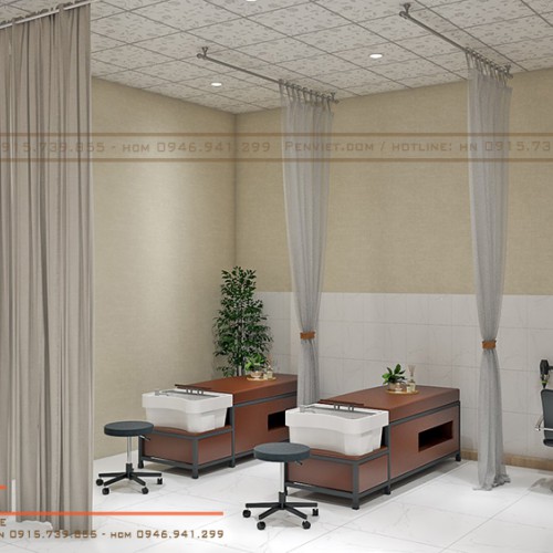 Tại phòng gội, 2 giường gỗ được đặt song song và được ngăn cách nhau bởi lớp rèm che tinh tế. Cùng với đó, Penviet cũng thiết kế bàn sấy tóc với chất liệu gỗ MDF phủ melamine vân gỗ với các ray keo tao khi đựng đồ mini tiện lợi. Khu vực này được trang trí thêm gương và ghế ngồi giúp khách hàng có thể sử dụng ngay sau khi thực hiện gội đầu, trị liệu.
