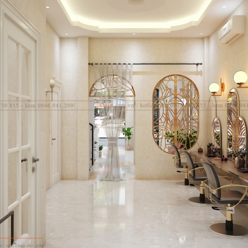 Phong cách: Sang trọng, trang nhã đẳng cấp đến từng khu vực và không gian khác nhau. Được thiết kế với tone màu trắng và inox vàng làm chủ đạo. Cùng với đó có sự tham gia của các màu như: Xanh, và màu ghi đã làm sinh động không gian phòng khách. Ngay tại mặt tiền, chúng tôi thiết kế cửa kính cường lực trong suốt vừa tôn được vẻ đẹp cao cấp của spa mà còn làm cho ánh sáng rực rỡ tươi mới của thiên nhiên len lỏi vào trong phòng.