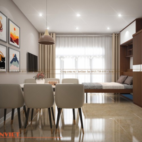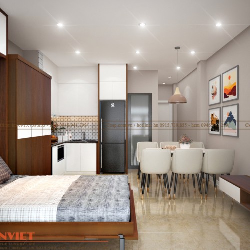 Khu vực bếp và bàn ăn được bố trí ngay gần cửa nhằm mang đến sự thuận tiện cho người sử dụng cũng như đảm bảo sự riêng tư cho khu vực giường ngủ phía trong.