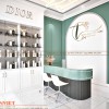 Nhằm tận dụng mặt bằng cũng như giới thiệu tới khách hàng những sản phẩm làm chất lượng đến từ những thương hiệu nổi tiếng, chúng tôi khéo léo bố trí tủ trưng bày bằng gỗ MDF phun sơn 2K, nẹp chỉ trang trí viền tủ, kính mài cạnh trong mẫu thiết kế spa Trang Beauty. Bộ chữ “DIOR” bằng Mica uốn nổi cùng hệ thống đèn Led hắt sáng góp phần tạo sự thu hút cho khu vực này.