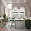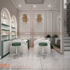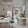 Màu trắng được lựa chọn làm gam màu chủ đạo tạo nên nét chuyên nghiệp cho cửa tiệm. Đồng thời, màu sắc này giúp phản xạ và luân chuyển ánh sáng tốt, tạo cảm giác không gian trở nên rộng rãi hơn. Ngoài ra, nó cũng làm nổi bật lên những điểm nhấn màu xanh thời thượng trong mẫu thiết kế spa này.