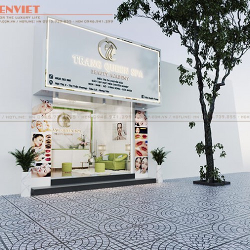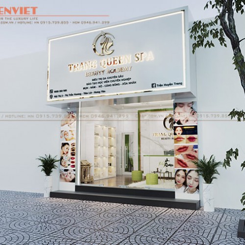 Nhằm mang đến hình ảnh nhất quán cho spa, Penviet thiết kế mặt tiền đơn giản, hiện đại, sử dụng biển quảng cáo bằng Alu, chỉ viền Alu mạ vàng với khung xương gia cố. Sự nổi bật được tạo nên nhờ việc trang trí hệ thống đèn Led và bộ nhận diện thương hiệu bằng Alu phát sáng chân cùng bộ chữ bằng Alu chân Mica trắng ghi thông tin cửa tiệm.