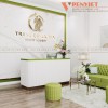 Vách sau quầy lễ tân được tạo nên từ gỗ MDF chống ẩm phủ Melamine, trang trí mặt PVC vân đá tôn lên Logo thương hiệu bằng Alu vàng gương, bộ chữ Alu phát sáng chân “TRANG QUEEN SPA” và “BEAUTY ACADEMY” bằng Alu chân mica trắng trong. Viền chỉ nhôm mạ vàng đan xen những chi tiết sơn xanh một cách hài hòa mang đến cảm giác vừa trẻ trung, vừa sang trọng cho khu vực này.